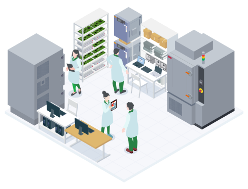 海外工場と映像を共有する設備を完備。当ラボにて解析を代行いたします。オンラインにて、現地の技術者の指示通りに試験・測定することが可能です。